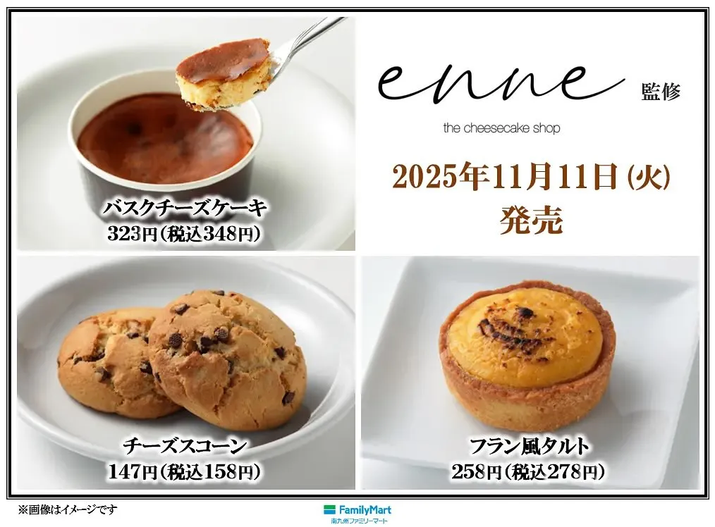 コラボ第一弾から続くenneの代表商品である「バスクチーズケーキ」をはじめ、enne伊集院本店で5月に販売し連日完売していた人気商品"フラン"をイメージした「フラン風タルト」、そして朝食や間食のコーヒーのお供に「チーズスコーン」を販売します。